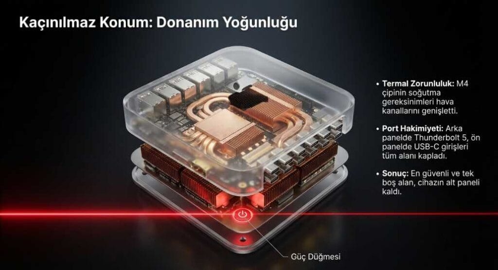 M4 mimarisi, yüksek performanslı çekirdekleri ve gelişmiş grafik birimini tek bir yongada toplar. Bu yonganın soğutulması için devasa bir bakır blok yerine akıllı bir hava kanalı sistemi kullanılır. Özellikle hava girişi ve çıkışı cihazın alt kısmındaki dairesel ızgara üzerinden gerçekleşir. Bu mimari yapı, anakartın dikey veya yatay yerleşiminde kısıtlamalar yaratır. Ancak Apple, butonu bu hava kanalının hemen yanına konumlandırarak mekanik karmaşayı çözdü.